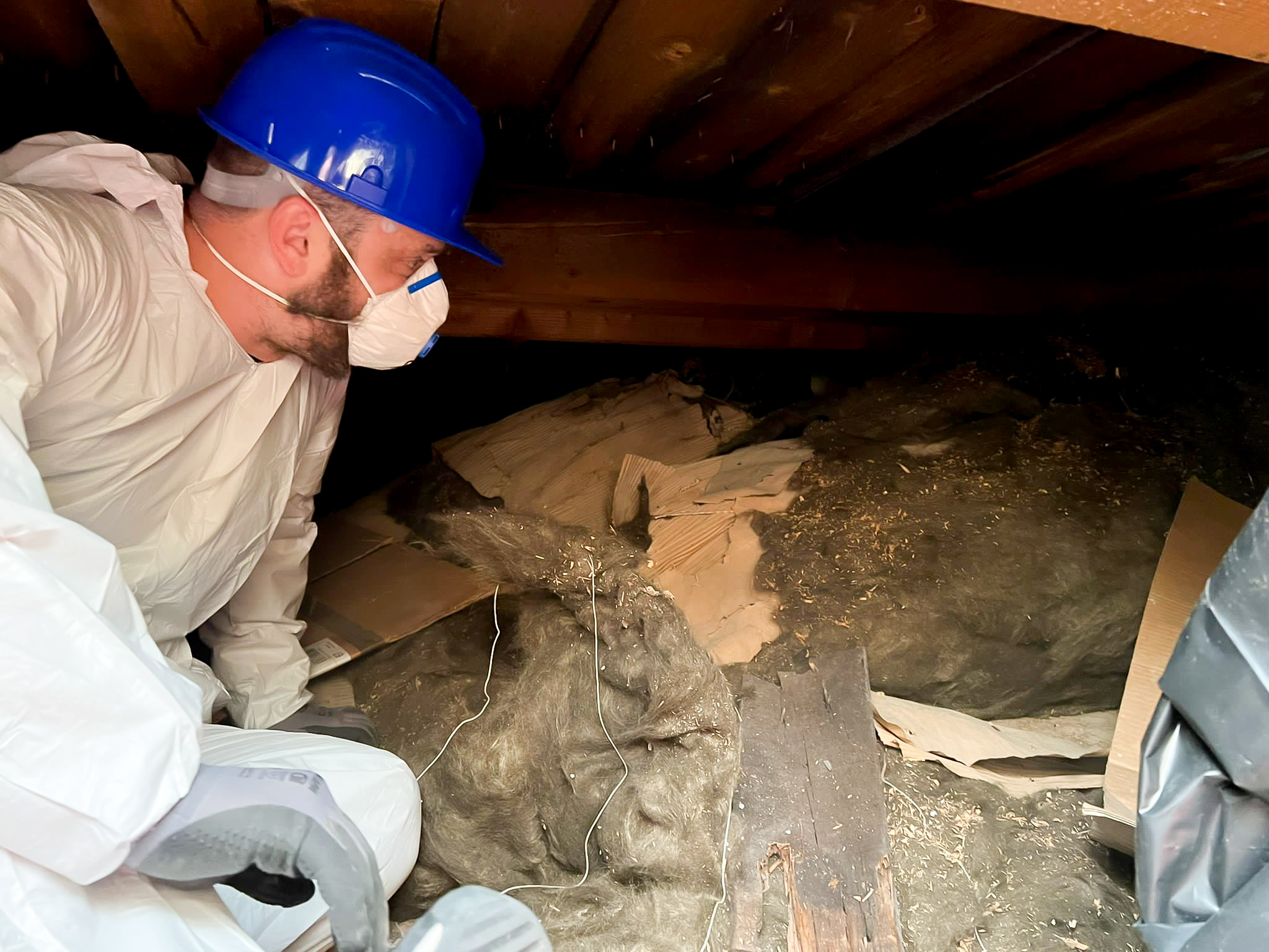 Přípravili jsme podmínky pro zafoukání minerální izolací Supafil Loft 45, která je pro tento typ střešní konstrukce ideální. Odstranili jsme zbytky nakumulované izolace, kterou izolatéři zapoměli odklidit, čím jsme zpřístupnili celou konstrukci a odhalili všechny neduhy špatně provedené izolace. Bylo také nnutné opravit parozábranu, která je na mnoha místech poškozená díky prostupům elektoinstalačních kabelů.